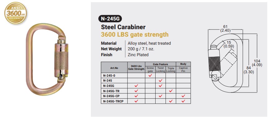 N-245 / STEEL CARABINER Canadian Office 580 Industrial DriveFort Erie, ONCanadaL2A 5M4 U.S.A. Address 2221 Kenmore AveSuite 106Buffalo, NY14207-1306 Head Office Address YOKE Industrial Corp.#39,33rd RoadTaichung Industrial ParkTaichung 407, Taiwan, R.O.C. Contact Us TEL 905-871-7111 custservice@yoke-niagara.com