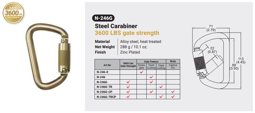 N-246G / STEEL CARABINER Canadian Office 580 Industrial DriveFort Erie, ONCanadaL2A 5M4 U.S.A. Address 2221 Kenmore AveSuite 106Buffalo, NY14207-1306 Head Office Address YOKE Industrial Corp.#39,33rd RoadTaichung Industrial ParkTaichung 407, Taiwan, R.O.C. Contact Us TEL 905-871-7111 custservice@yoke-niagara.com