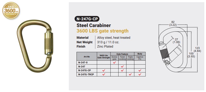 N-247G / Steel CARABINER Canadian Office 580 Industrial DriveFort Erie, ONCanadaL2A 5M4 U.S.A. Address 2221 Kenmore AveSuite 106Buffalo, NY14207-1306 Head Office Address YOKE Industrial Corp.#39,33rd RoadTaichung Industrial ParkTaichung 407, Taiwan, R.O.C. Contact Us TEL 905-871-7111 custservice@yoke-niagara.com