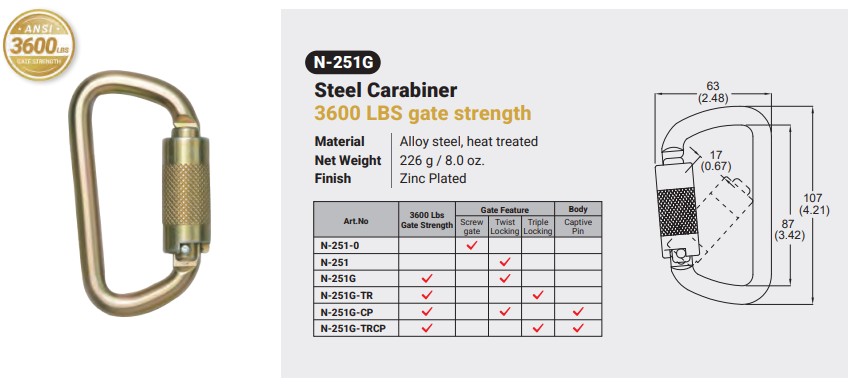 N-251G / Steel CARABINER Canadian Office 580 Industrial DriveFort Erie, ONCanadaL2A 5M4 U.S.A. Address 2221 Kenmore AveSuite 106Buffalo, NY14207-1306 Head Office Address YOKE Industrial Corp.#39,33rd RoadTaichung Industrial ParkTaichung 407, Taiwan, R.O.C. Contact Us TEL 905-871-7111 custservice@yoke-niagara.com
