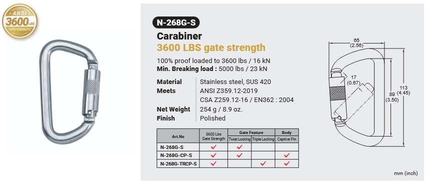 N-268G-S CARABINER Canadian Office 580 Industrial DriveFort Erie, ONCanadaL2A 5M4 U.S.A. Address 2221 Kenmore AveSuite 106Buffalo, NY14207-1306 Head Office Address YOKE Industrial Corp.#39,33rd RoadTaichung Industrial ParkTaichung 407, Taiwan, R.O.C. Contact Us TEL 905-871-7111 custservice@yoke-niagara.com