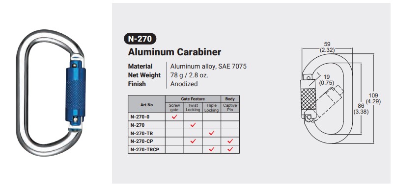 N-270 / ALUMINUM CARABINER Canadian Office 580 Industrial DriveFort Erie, ONCanadaL2A 5M4 U.S.A. Address 2221 Kenmore AveSuite 106Buffalo, NY14207-1306 Head Office Address YOKE Industrial Corp.#39,33rd RoadTaichung Industrial ParkTaichung 407, Taiwan, R.O.C. Contact Us TEL 905-871-7111 custservice@yoke-niagara.com