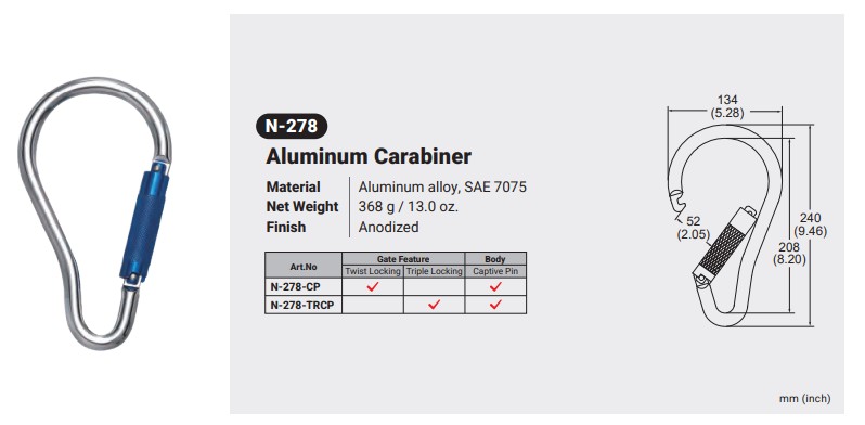 N-278 / ALUMINUM CARABINER Canadian Office 580 Industrial DriveFort Erie, ONCanadaL2A 5M4 U.S.A. Address 2221 Kenmore AveSuite 106Buffalo, NY14207-1306 Head Office Address YOKE Industrial Corp.#39,33rd RoadTaichung Industrial ParkTaichung 407, Taiwan, R.O.C. Contact Us TEL 905-871-7111 custservice@yoke-niagara.com