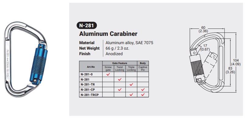 N-281 / ALUMINUM CARABINER Canadian Office 580 Industrial DriveFort Erie, ONCanadaL2A 5M4 U.S.A. Address 2221 Kenmore AveSuite 106Buffalo, NY14207-1306 Head Office Address YOKE Industrial Corp.#39,33rd RoadTaichung Industrial ParkTaichung 407, Taiwan, R.O.C. Contact Us TEL 905-871-7111 custservice@yoke-niagara.com