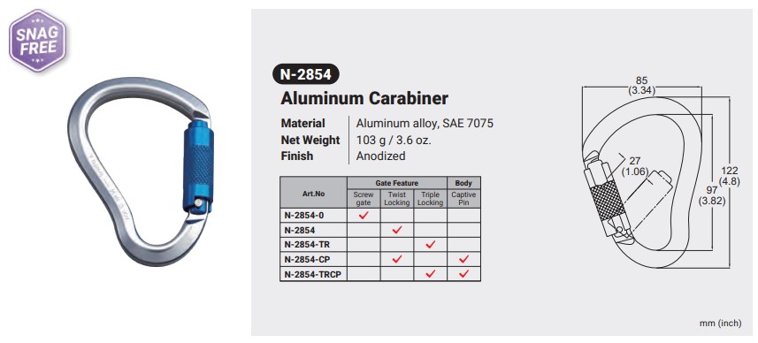 N-2854 / ALUMINUM CARABINER Canadian Office 580 Industrial DriveFort Erie, ONCanadaL2A 5M4 U.S.A. Address 2221 Kenmore AveSuite 106Buffalo, NY14207-1306 Head Office Address YOKE Industrial Corp.#39,33rd RoadTaichung Industrial ParkTaichung 407, Taiwan, R.O.C. Contact Us TEL 905-871-7111 custservice@yoke-niagara.com