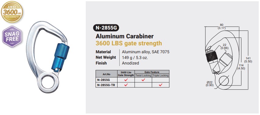 N-2855G / ALUMINUM CARABINER Canadian Office 580 Industrial DriveFort Erie, ONCanadaL2A 5M4 U.S.A. Address 2221 Kenmore AveSuite 106Buffalo, NY14207-1306 Head Office Address YOKE Industrial Corp.#39,33rd RoadTaichung Industrial ParkTaichung 407, Taiwan, R.O.C. Contact Us TEL 905-871-7111 custservice@yoke-niagara.com