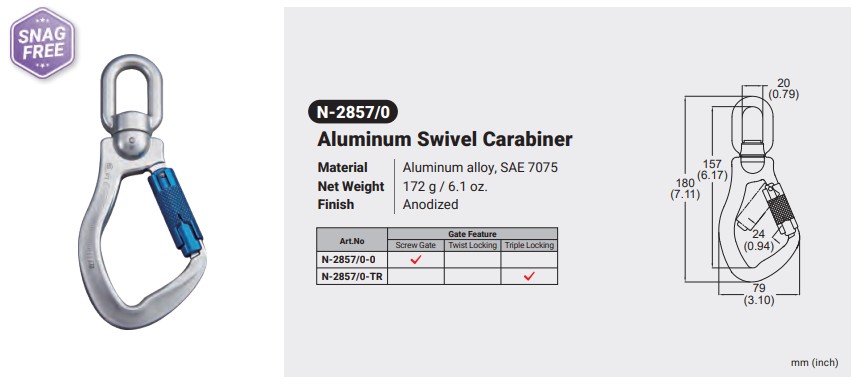 N-2857/0 / ALUMINUM SWIVEL CARABINER (NON-INDICATOR) Canadian Office 580 Industrial DriveFort Erie, ONCanadaL2A 5M4 U.S.A. Address 2221 Kenmore AveSuite 106Buffalo, NY14207-1306 Head Office Address YOKE Industrial Corp.#39,33rd RoadTaichung Industrial ParkTaichung 407, Taiwan, R.O.C. Contact Us TEL 905-871-7111 custservice@yoke-niagara.com