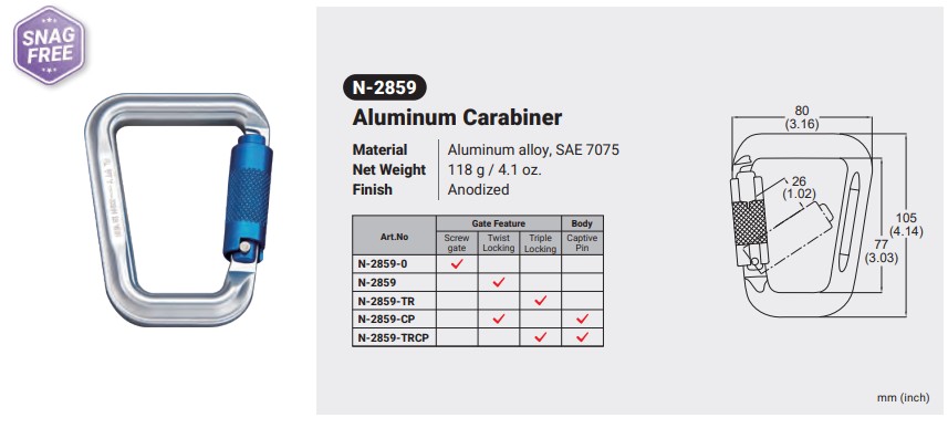 N-2859 / ALUMINUM CARABINER Canadian Office 580 Industrial DriveFort Erie, ONCanadaL2A 5M4 U.S.A. Address 2221 Kenmore AveSuite 106Buffalo, NY14207-1306 Head Office Address YOKE Industrial Corp.#39,33rd RoadTaichung Industrial ParkTaichung 407, Taiwan, R.O.C. Contact Us TEL 905-871-7111 custservice@yoke-niagara.com