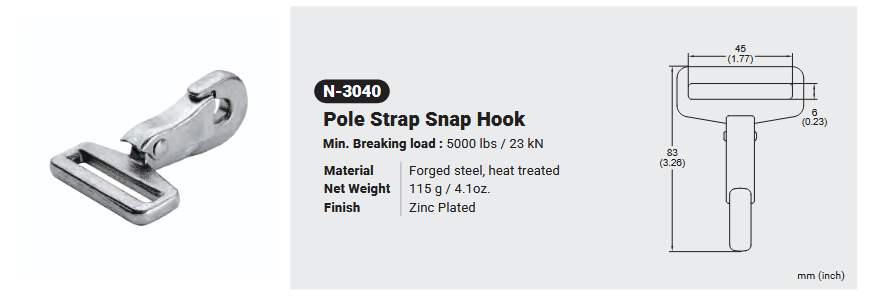 N-3040 / POLE STRAP SNAP HOOK Canadian Office 580 Industrial DriveFort Erie, ONCanadaL2A 5M4 U.S.A. Address 2221 Kenmore AveSuite 106Buffalo, NY14207-1306 Head Office Address YOKE Industrial Corp.#39,33rd RoadTaichung Industrial ParkTaichung 407, Taiwan, R.O.C. Contact Us TEL 905-871-7111 custservice@yoke-niagara.com