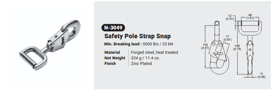 N-3049 / SAFETY POLE STRAP SNAP Canadian Office 580 Industrial DriveFort Erie, ONCanadaL2A 5M4 U.S.A. Address 2221 Kenmore AveSuite 106Buffalo, NY14207-1306 Head Office Address YOKE Industrial Corp.#39,33rd RoadTaichung Industrial ParkTaichung 407, Taiwan, R.O.C. Contact Us TEL 905-871-7111 custservice@yoke-niagara.com