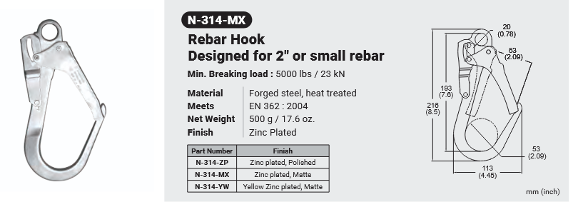 N-314-MX / REBAR HOOK DESIGNED FOR 2″ OR SMALL REBAR Canadian Office 580 Industrial DriveFort Erie, ONCanadaL2A 5M4 U.S.A. Address 2221 Kenmore AveSuite 106Buffalo, NY14207-1306 Head Office Address YOKE Industrial Corp.#39,33rd RoadTaichung Industrial ParkTaichung 407, Taiwan, R.O.C. Contact Us TEL 905-871-7111 custservice@yoke-niagara.com