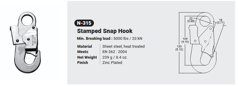 N-315 / STAMPED SNAP HOOK Canadian Office 580 Industrial DriveFort Erie, ONCanadaL2A 5M4 U.S.A. Address 2221 Kenmore AveSuite 106Buffalo, NY14207-1306 Head Office Address YOKE Industrial Corp.#39,33rd RoadTaichung Industrial ParkTaichung 407, Taiwan, R.O.C. Contact Us TEL 905-871-7111 custservice@yoke-niagara.com