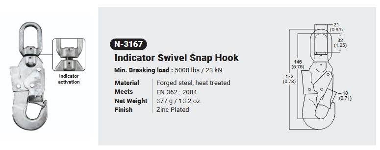 N-3167 / INDICATOR SWIVEL SNAP HOOK Canadian Office 580 Industrial DriveFort Erie, ONCanadaL2A 5M4 U.S.A. Address 2221 Kenmore AveSuite 106Buffalo, NY14207-1306 Head Office Address YOKE Industrial Corp.#39,33rd RoadTaichung Industrial ParkTaichung 407, Taiwan, R.O.C. Contact Us TEL 905-871-7111 custservice@yoke-niagara.com