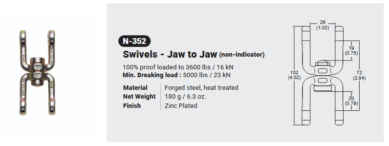 N-352 / SWIVELS – EYE TO EYE (NON-INDICATOR) Canadian Office 580 Industrial DriveFort Erie, ONCanadaL2A 5M4 U.S.A. Address 2221 Kenmore AveSuite 106Buffalo, NY14207-1306 Head Office Address YOKE Industrial Corp.#39,33rd RoadTaichung Industrial ParkTaichung 407, Taiwan, R.O.C. Contact Us TEL 905-871-7111 custservice@yoke-niagara.com