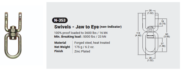 N-353 / SWIVELS – EYE TO EYE(NON-INDICATOR) Canadian Office 580 Industrial DriveFort Erie, ONCanadaL2A 5M4 U.S.A. Address 2221 Kenmore AveSuite 106Buffalo, NY14207-1306 Head Office Address YOKE Industrial Corp.#39,33rd RoadTaichung Industrial ParkTaichung 407, Taiwan, R.O.C. Contact Us TEL 905-871-7111 custservice@yoke-niagara.com