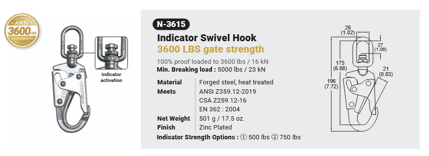 N-3615 / INDICATOR SWIVEL HOOK (3600 LBS GATE STRENGTH) Canadian Office 580 Industrial DriveFort Erie, ONCanadaL2A 5M4 U.S.A. Address 2221 Kenmore AveSuite 106Buffalo, NY14207-1306 Head Office Address YOKE Industrial Corp.#39,33rd RoadTaichung Industrial ParkTaichung 407, Taiwan, R.O.C. Contact Us TEL 905-871-7111 custservice@yoke-niagara.com