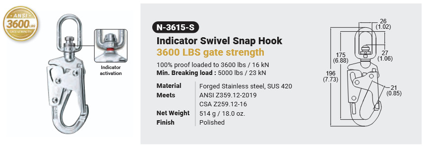 N-3615-S INDICATOR SWIVEL SNAP HOOK 3600 LBS GATE STRENGTH Canadian Office 580 Industrial DriveFort Erie, ONCanadaL2A 5M4 U.S.A. Address 2221 Kenmore AveSuite 106Buffalo, NY14207-1306 Head Office Address YOKE Industrial Corp.#39,33rd RoadTaichung Industrial ParkTaichung 407, Taiwan, R.O.C. Contact Us TEL 905-871-7111 custservice@yoke-niagara.com