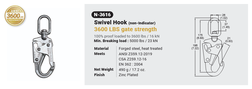 N-3616 / SWIVEL HOOK 3600 LBS GATE STRENGTH (NON-INDICATOR) Canadian Office 580 Industrial DriveFort Erie, ONCanadaL2A 5M4 U.S.A. Address 2221 Kenmore AveSuite 106Buffalo, NY14207-1306 Head Office Address YOKE Industrial Corp.#39,33rd RoadTaichung Industrial ParkTaichung 407, Taiwan, R.O.C. Contact Us TEL 905-871-7111 custservice@yoke-niagara.com