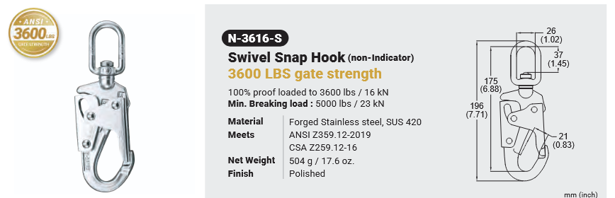 n-3616-S sWIVEL SNAP HOOK 3600 LBS GATE STRENGTH (NON-INDICATOR) Canadian Office 580 Industrial DriveFort Erie, ONCanadaL2A 5M4 U.S.A. Address 2221 Kenmore AveSuite 106Buffalo, NY14207-1306 Head Office Address YOKE Industrial Corp.#39,33rd RoadTaichung Industrial ParkTaichung 407, Taiwan, R.O.C. Contact Us TEL 905-871-7111 custservice@yoke-niagara.com
