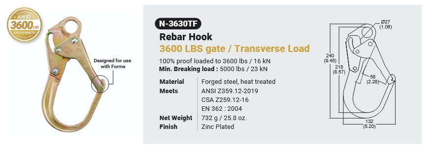 N-3630TF Rebar hook 3600 lbs gate / traverse load Canadian Office 580 Industrial DriveFort Erie, ONCanadaL2A 5M4 U.S.A. Address 2221 Kenmore AveSuite 106Buffalo, NY14207-1306 Head Office Address YOKE Industrial Corp.#39,33rd RoadTaichung Industrial ParkTaichung 407, Taiwan, R.O.C. Contact Us TEL 905-871-7111 custservice@yoke-niagara.com