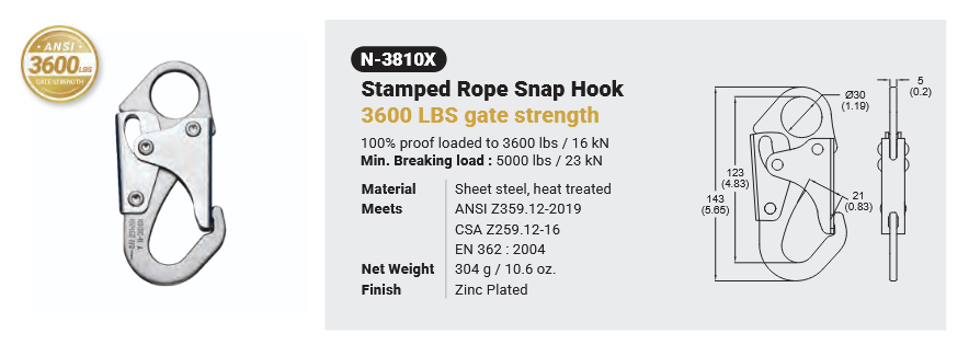 N-3810X / STAMPED ROPE SNAP HOOK (3600 LBS GATE STRENGTH) Canadian Office 580 Industrial DriveFort Erie, ONCanadaL2A 5M4 U.S.A. Address 2221 Kenmore AveSuite 106Buffalo, NY14207-1306 Head Office Address YOKE Industrial Corp.#39,33rd RoadTaichung Industrial ParkTaichung 407, Taiwan, R.O.C. Contact Us TEL 905-871-7111 custservice@yoke-niagara.com