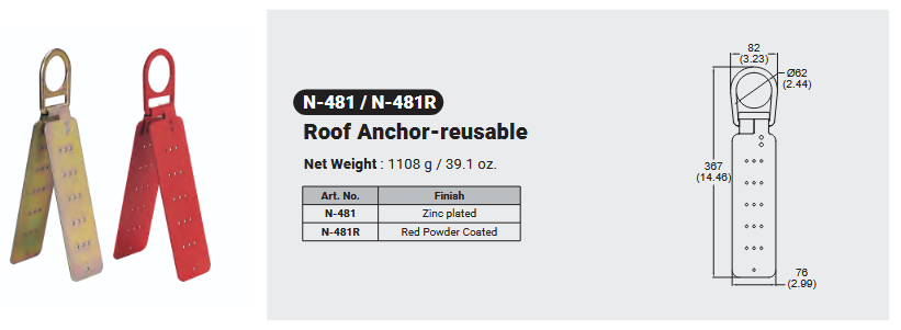 N-481 / n481r rOOF aNCHOR rEUSABLE Canadian Office 580 Industrial DriveFort Erie, ONCanadaL2A 5M4 U.S.A. Address 2221 Kenmore AveSuite 106Buffalo, NY14207-1306 Head Office Address YOKE Industrial Corp.#39,33rd RoadTaichung Industrial ParkTaichung 407, Taiwan, R.O.C. Contact Us TEL 905-871-7111 custservice@yoke-niagara.com