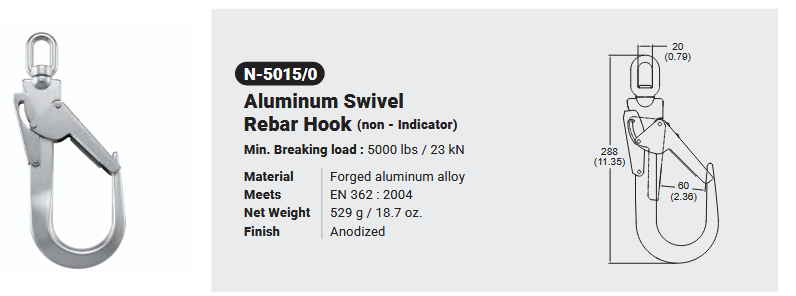 N-5015/0 aLUMINUM SWIVEL REBAR HOOK (nON-INDICATOR) Canadian Office 580 Industrial DriveFort Erie, ONCanadaL2A 5M4 U.S.A. Address 2221 Kenmore AveSuite 106Buffalo, NY14207-1306 Head Office Address YOKE Industrial Corp.#39,33rd RoadTaichung Industrial ParkTaichung 407, Taiwan, R.O.C. Contact Us TEL 905-871-7111 custservice@yoke-niagara.com
