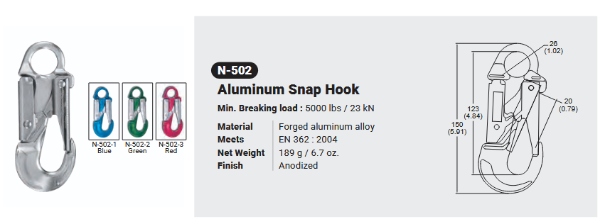 N-502 / ALUMINUM SNAP HOOK Canadian Office 580 Industrial DriveFort Erie, ONCanadaL2A 5M4 U.S.A. Address 2221 Kenmore AveSuite 106Buffalo, NY14207-1306 Head Office Address YOKE Industrial Corp.#39,33rd RoadTaichung Industrial ParkTaichung 407, Taiwan, R.O.C. Contact Us TEL 905-871-7111 custservice@yoke-niagara.com