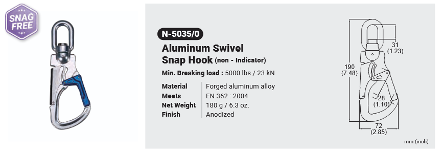 N-5035/0 ALUMINUM SWIVEL SNAP HOOK (NON-INDICATOR) Canadian Office 580 Industrial DriveFort Erie, ONCanadaL2A 5M4 U.S.A. Address 2221 Kenmore AveSuite 106Buffalo, NY14207-1306 Head Office Address YOKE Industrial Corp.#39,33rd RoadTaichung Industrial ParkTaichung 407, Taiwan, R.O.C. Contact Us TEL 905-871-7111 custservice@yoke-niagara.com