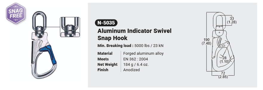 N-5035 ALUMINUM INDICATOR SWIVEL SNAP HOOK Canadian Office 580 Industrial DriveFort Erie, ONCanadaL2A 5M4 U.S.A. Address 2221 Kenmore AveSuite 106Buffalo, NY14207-1306 Head Office Address YOKE Industrial Corp.#39,33rd RoadTaichung Industrial ParkTaichung 407, Taiwan, R.O.C. Contact Us TEL 905-871-7111 custservice@yoke-niagara.com