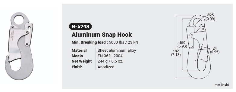 N-5248 / ALUMINUM SNAP HOOK Canadian Office 580 Industrial DriveFort Erie, ONCanadaL2A 5M4 U.S.A. Address 2221 Kenmore AveSuite 106Buffalo, NY14207-1306 Head Office Address YOKE Industrial Corp.#39,33rd RoadTaichung Industrial ParkTaichung 407, Taiwan, R.O.C. Contact Us TEL 905-871-7111 custservice@yoke-niagara.com