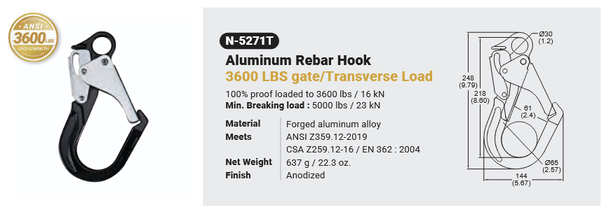 N-5271T / ALUMINUM REBAR HOOK 3600 LBS GATE STRENGTH Canadian Office 580 Industrial DriveFort Erie, ONCanadaL2A 5M4 U.S.A. Address 2221 Kenmore AveSuite 106Buffalo, NY14207-1306 Head Office Address YOKE Industrial Corp.#39,33rd RoadTaichung Industrial ParkTaichung 407, Taiwan, R.O.C. Contact Us TEL 905-871-7111 custservice@yoke-niagara.com