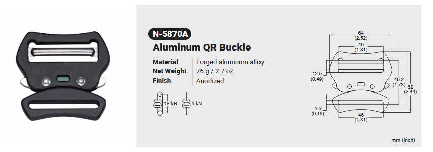 N-5870A ALUMINUM QR BUCKLE Canadian Office 580 Industrial DriveFort Erie, ONCanadaL2A 5M4 U.S.A. Address 2221 Kenmore AveSuite 106Buffalo, NY14207-1306 Head Office Address YOKE Industrial Corp.#39,33rd RoadTaichung Industrial ParkTaichung 407, Taiwan, R.O.C. Contact Us TEL 905-871-7111 custservice@yoke-niagara.com