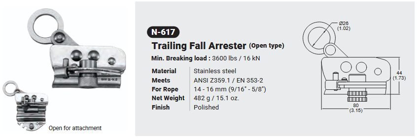 N-617 FALL aRRESTER (OPEN TYPE) Canadian Office 580 Industrial DriveFort Erie, ONCanadaL2A 5M4 U.S.A. Address 2221 Kenmore AveSuite 106Buffalo, NY14207-1306 Head Office Address YOKE Industrial Corp.#39,33rd RoadTaichung Industrial ParkTaichung 407, Taiwan, R.O.C. Contact Us TEL 905-871-7111 custservice@yoke-niagara.com