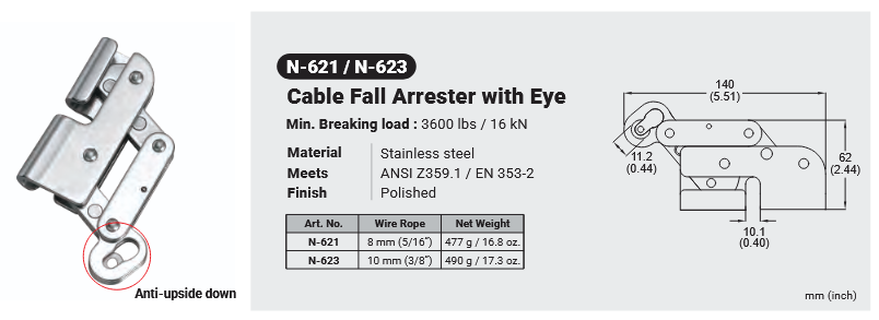 N-621/N-623 Cable Fall Arrester With Eye Canadian Office 580 Industrial DriveFort Erie, ONCanadaL2A 5M4 U.S.A. Address 2221 Kenmore AveSuite 106Buffalo, NY14207-1306 Head Office Address YOKE Industrial Corp.#39,33rd RoadTaichung Industrial ParkTaichung 407, Taiwan, R.O.C. Contact Us TEL 905-871-7111 custservice@yoke-niagara.com