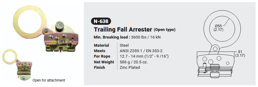 N-638 fALL aRRESTER (OPEN TYPE) Canadian Office 580 Industrial DriveFort Erie, ONCanadaL2A 5M4 U.S.A. Address 2221 Kenmore AveSuite 106Buffalo, NY14207-1306 Head Office Address YOKE Industrial Corp.#39,33rd RoadTaichung Industrial ParkTaichung 407, Taiwan, R.O.C. Contact Us TEL 905-871-7111 custservice@yoke-niagara.com