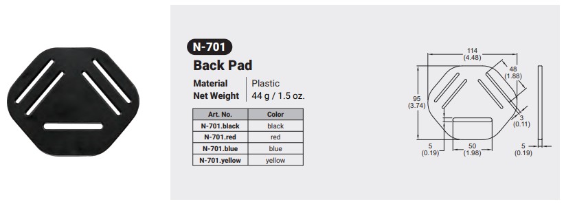 N-701 / PLASTIC BACK PAD Canadian Office 580 Industrial DriveFort Erie, ONCanadaL2A 5M4 U.S.A. Address 2221 Kenmore AveSuite 106Buffalo, NY14207-1306 Head Office Address YOKE Industrial Corp.#39,33rd RoadTaichung Industrial ParkTaichung 407, Taiwan, R.O.C. Contact Us TEL 905-871-7111 custservice@yoke-niagara.com