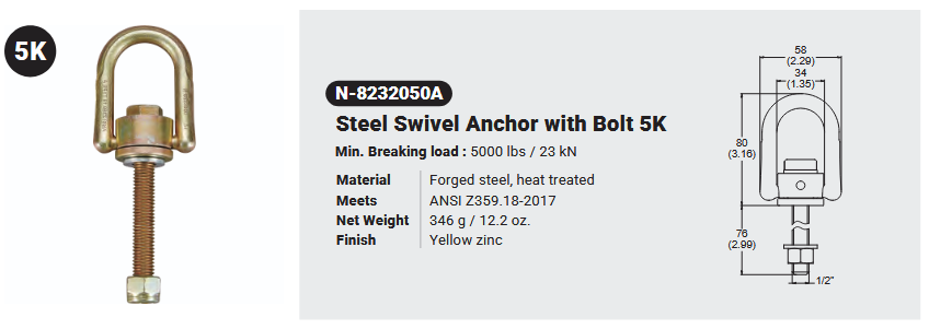 N-8232050A STEEL SWIVEL ANCHOR W/ BOLT 5K Canadian Office 580 Industrial DriveFort Erie, ONCanadaL2A 5M4 U.S.A. Address 2221 Kenmore AveSuite 106Buffalo, NY14207-1306 Head Office Address YOKE Industrial Corp.#39,33rd RoadTaichung Industrial ParkTaichung 407, Taiwan, R.O.C. Contact Us TEL 905-871-7111 custservice@yoke-niagara.com
