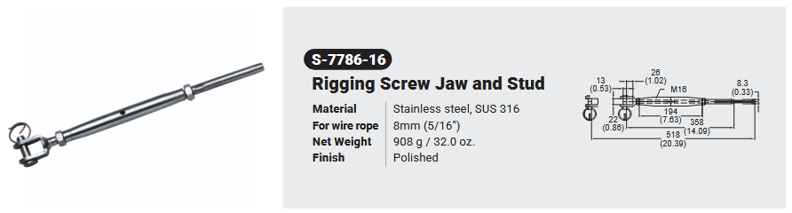 S-7786-16 / RIGGING SCREW JAW AND STUD Canadian Office 580 Industrial DriveFort Erie, ONCanadaL2A 5M4 U.S.A. Address 2221 Kenmore AveSuite 106Buffalo, NY14207-1306 Head Office Address YOKE Industrial Corp.#39,33rd RoadTaichung Industrial ParkTaichung 407, Taiwan, R.O.C. Contact Us TEL 905-871-7111 custservice@yoke-niagara.com